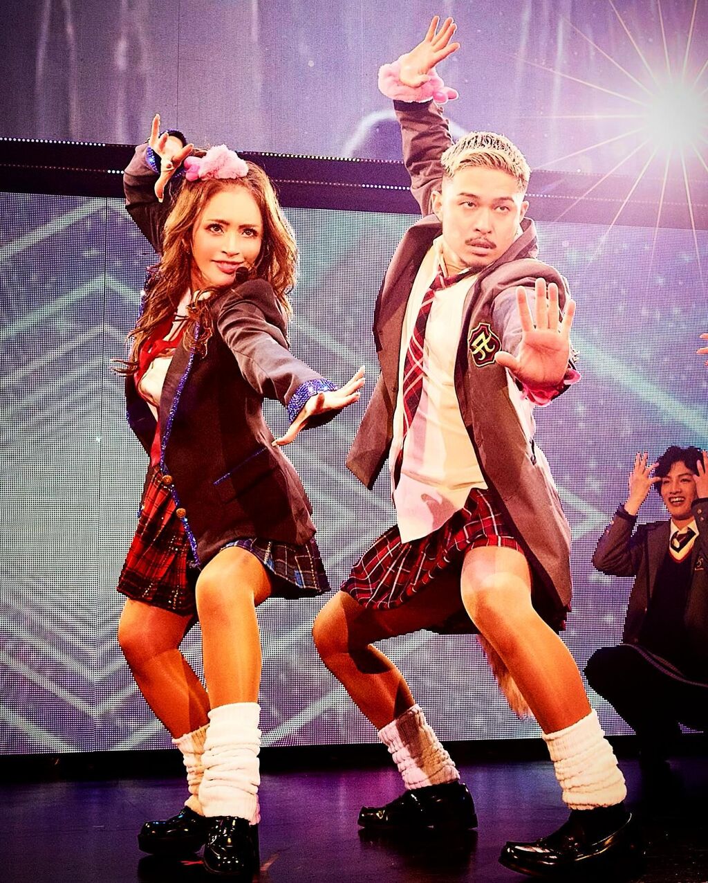 チェック柄のミニスカートにルーズソックスを合わせ、同じく制服姿のバックダンサーとステージでポーズを決める浜崎。