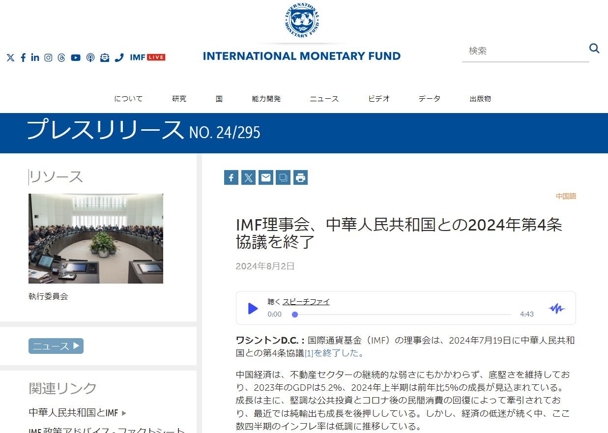 2024年08月02日、『IMF』(International Monetary Fundの略:国際通貨基金)が「IMF Executive Board Concludes 2024 Article IV Consultation with the People’s Republic of China(IMF理事会、中華人民共和国との2024年第4条協議を終了)」という文書を公表しました。