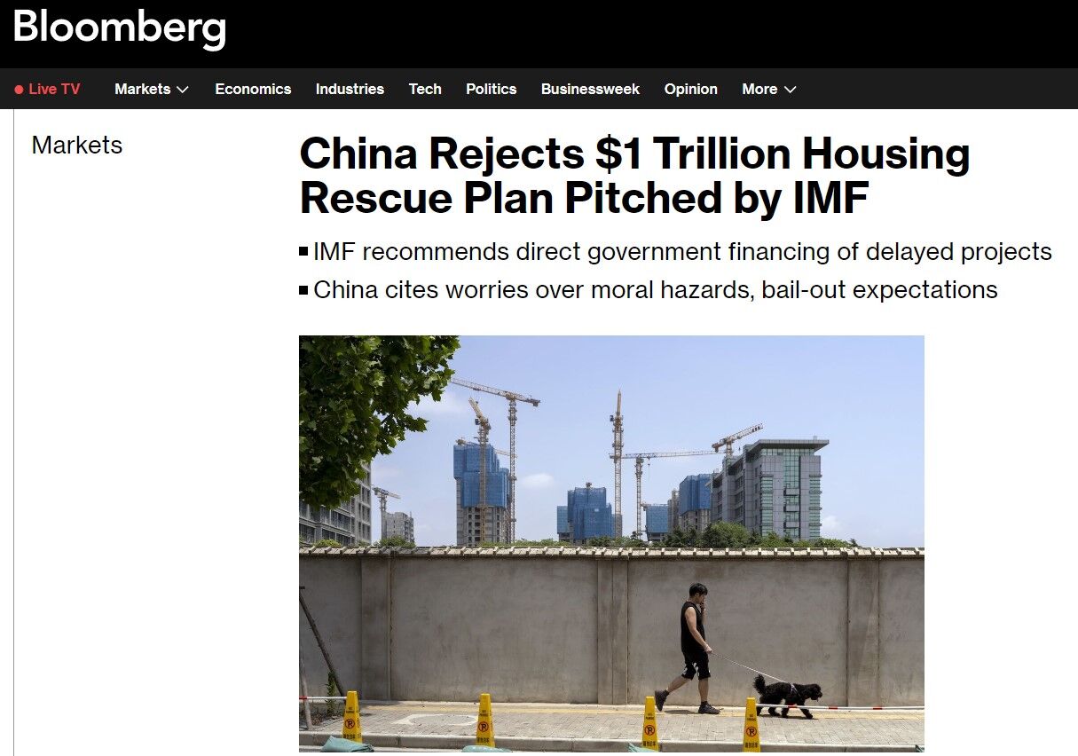 ↑『Bloomberg』の記事「China Rejects $1 Trillion Housing Rescue Plan Pitched by IMF(中国、IMFが提案した1兆ドルの住宅救済計画を拒否)」。