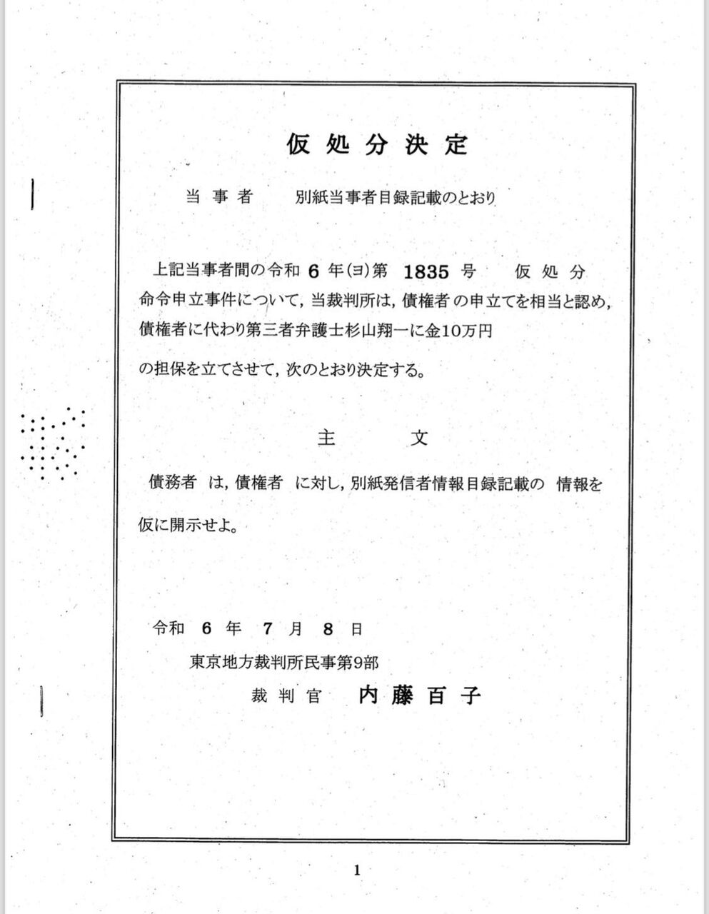 「開示仮処分命令対象投稿一覧」を公開した。「投稿者の方またはその関係者に関しては下記に連絡していただけたら幸いです」として代理人・杉山翔一弁護士の連絡先を記した。